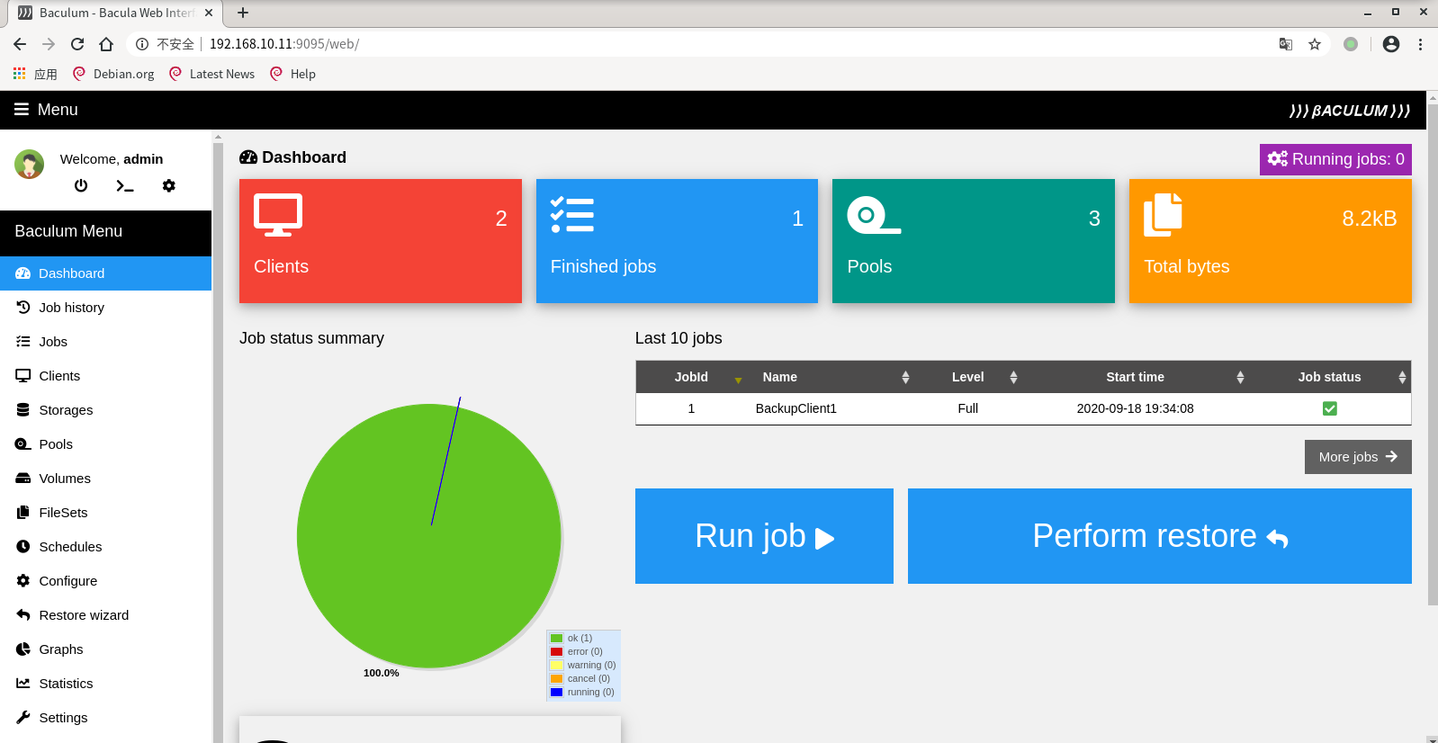 [root@baculasrv ~]# bconsole Connecting to Director baculasrv.1000cc.net:9101 1000 OK: bacula-dir Version: 5.2.13 (19 February 2013) Enter a period to cancel a command. *label # 创建一个备份 Automatically selected Catalog: MyCatalog Using Catalog "MyCatalog" Automatically selected Storage: File Enter new Volume name:Vol-client-20200125 Defined Pools: 1: Default 2: File 3: Scratch Select the Pool (1-3):2 Connecting to Storage daemon File at baculasrv.1000cc.net:9103 ... Sending label command for Volume "Vol-client-20200125" Slot 0 ... 3000 OK label. VolBytes=214 DVD=0 Volume="Vol-client-20200125" Device="FileStorage" (/tmp) Catalog record for Volume "Vol-client-20200125", Slot 0 successfully created. Requesting to mount FileStorage ... 3906 File device ""FileStorage" (/tmp)" is always mounted. *run # 开始备份 A job name must be specified. The defined Job resources are: 1: BackupClient1 2: BackupCatalog 3: RestoreFiles Select Job resource (1-3): 1 Run Backup job JobName: BackupClient1 Level: Incremental Client: bacula-fd FileSet: Full Set Pool: File (From Job resource) Storage: File (From Job resource) When: 2020-01-25 19:01:43 Priority: 10 OK to run? (yes/mod/no): yes *message ...... ...... Termination: Backup OK